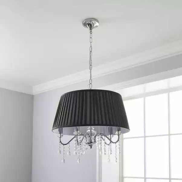 Add a glamorous touch to your décor with the Dorma Genevieve 5 Light Ceiling Fitting. Exquisitely designed with a modern chrome base, detailed with stunning clear crystals and faceted crystal droplets. This luxurious piece is complete with a circular Grey faux silk shade with a double taped trimmed detailed finish and suspended from a height adjustable chain set. Matching Dorma Genevieve pieces are available to help coordinate your décor.