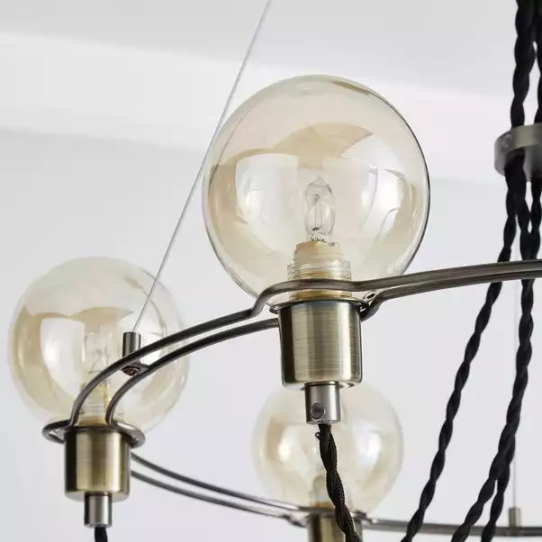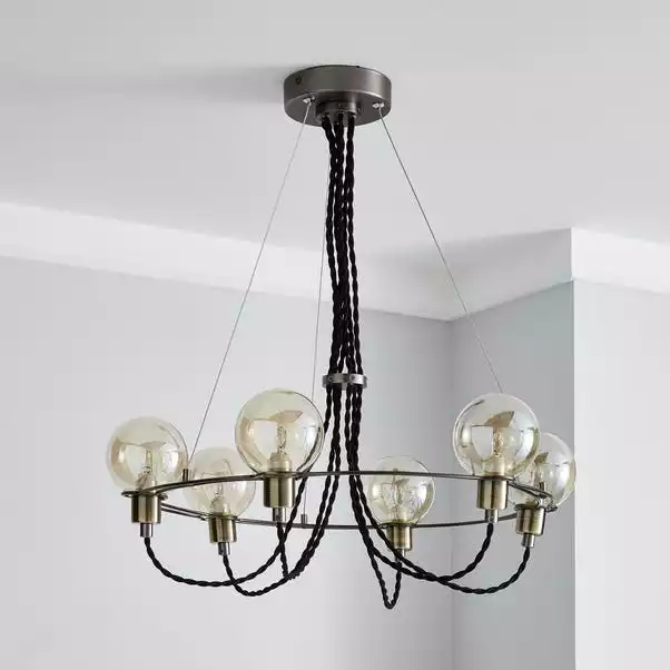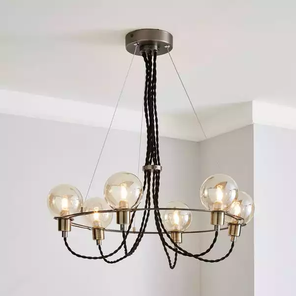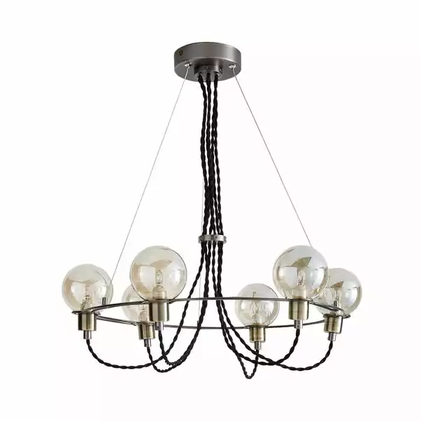 With its gorgeous satin nickel finish, the Aurelia 6 light ceiling fitting is perfect for adding a modern touch to your home. This light features 6 glass bulb-like shades, housed on a circular frame with black rope cables to complete the look.