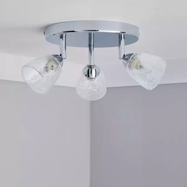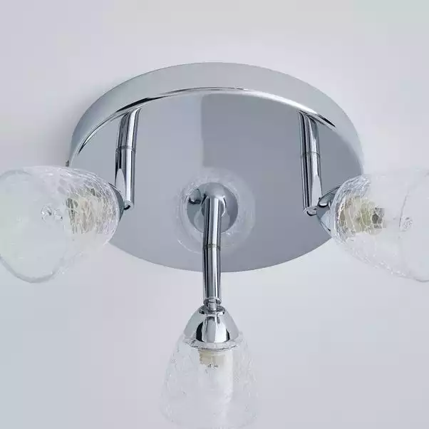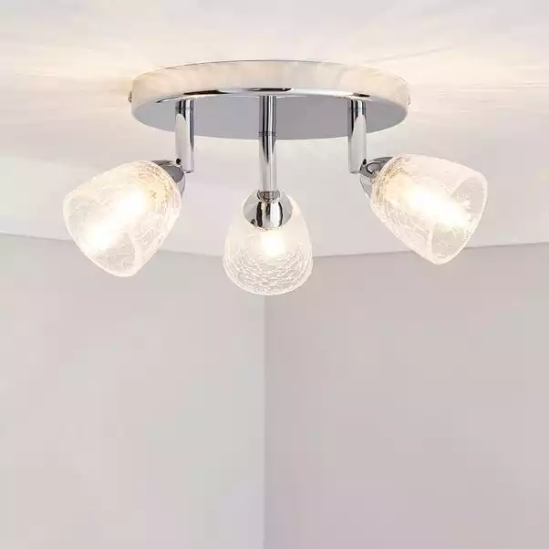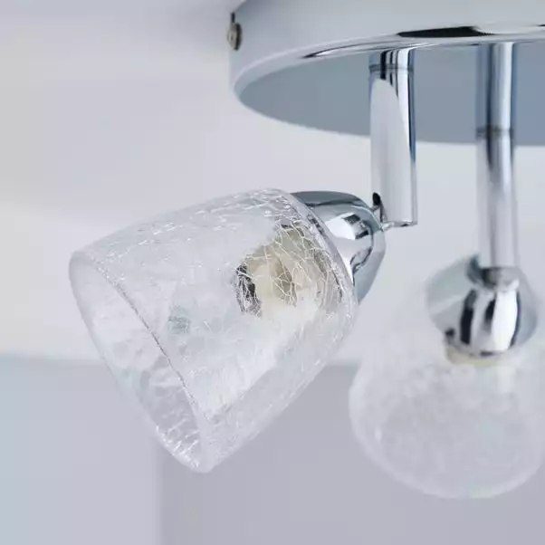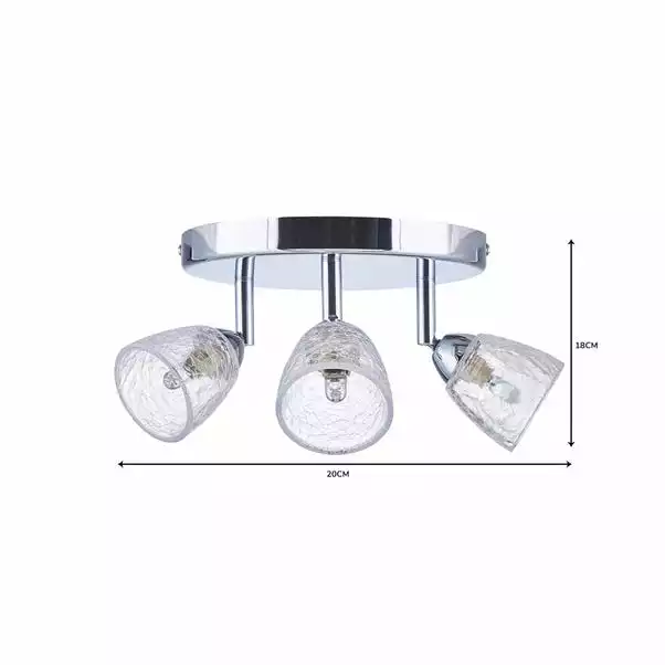 Beautifully crafted with a chrome finished base dimmable setting and adjustable heads. This stunning spotlight features three lights with decorative crackle glass shades.