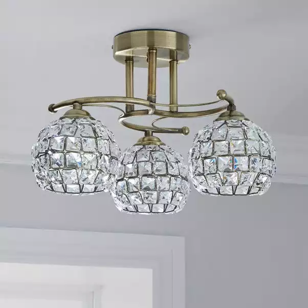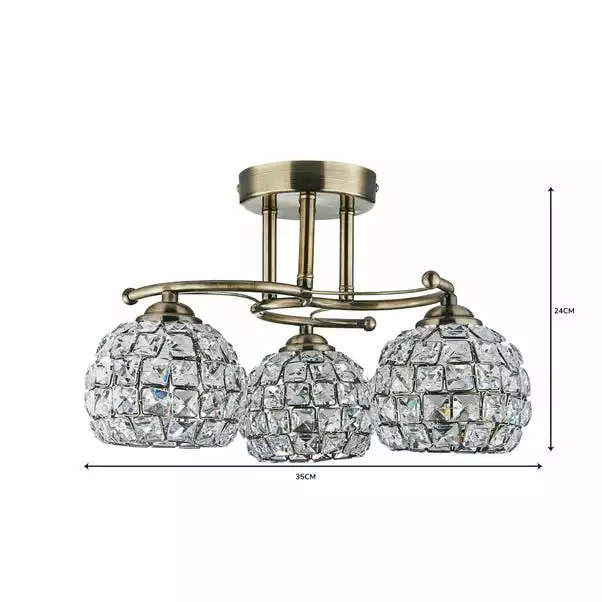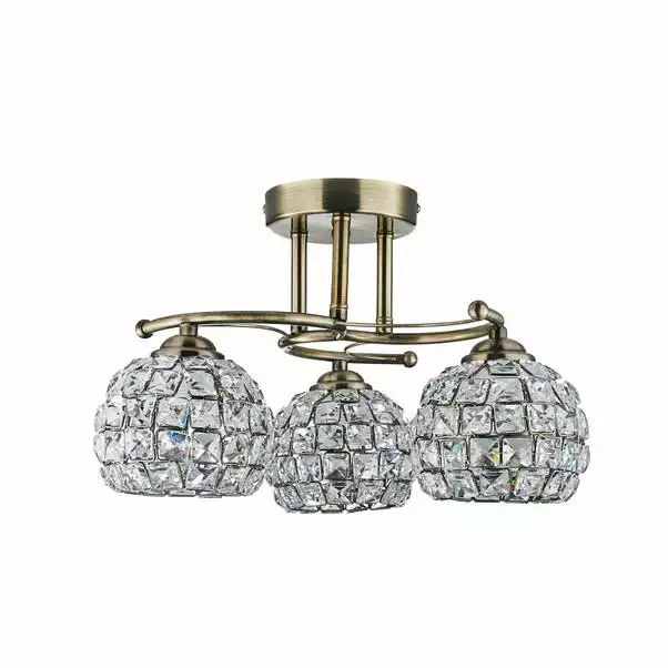 Beautifully crafted with an antique brass finish, this stunning light fitting features delicately curled arms and three round shades designed with square K9 crystals.
