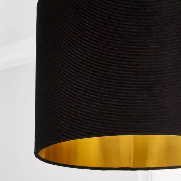 This beautiful shade is the perfect piece to accompany your home this year. Complementing an array of decors, this large black shade with a gold interior has a white frame and will look gorgeous anywhere in the house.