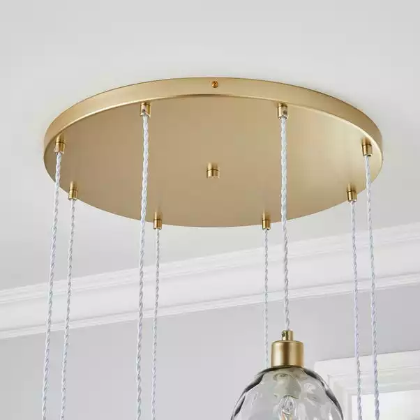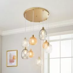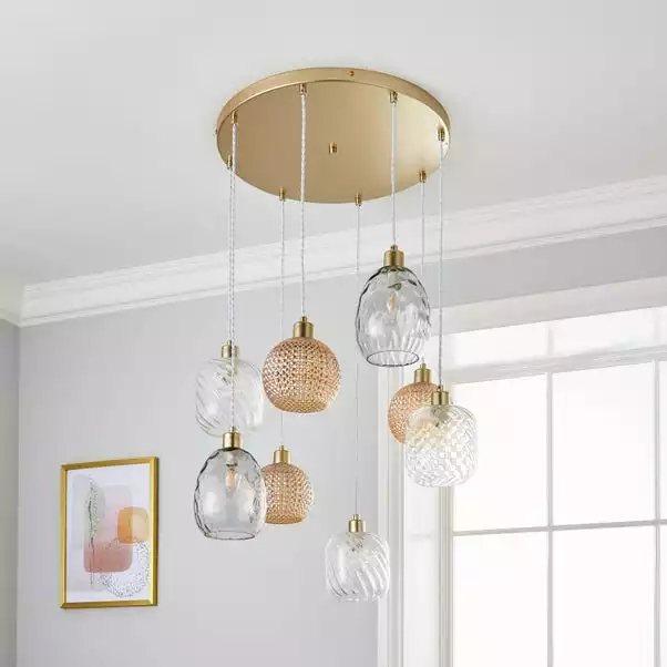 Featuring gold printed details and white twisted cables, the Elodie Cluster Ceiling Fitting has a variety of glass shades that can be varied in height to suit your personal preference. The light features 3 x amber round glass shades, 3 x clear lozenge glass shades and 2 x smoke dimpled cylinder glass shades. 8 x SES/E14 Candle bulbs are required to be purchased in conjunction with the Elodie Cluster Ceiling Light. Fully dimmable compatible with a suitable bulb and light switch. Matching family items are available in the Elodie range.