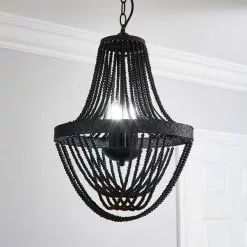 Boasting a bold design with traditional design elements, the Ethel beaded chandelier would add a stunning opulent touch to your home. Finished in a choice of white or black painted finishes, this 3-light chandelier features intricate metal embossed detail with hand-strung wooden beads and a height adjustable chain suspension.