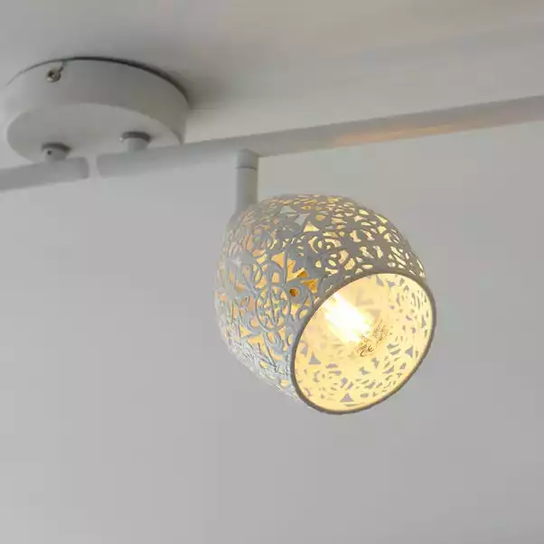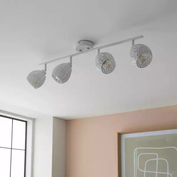 Add a feminine element to your home with this gorgeous Fearne 4 Light Spotlight Bar, beautifully designed with a matt white paint metal base and 4 spotlights with dainty patterned detail shades, the split bar allows further adjustment options. This spotlight will look beautiful in any room and you can even coordinate your home with matching family items. Dimmable compatible with a suitable light switch and bulb.