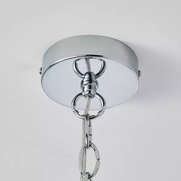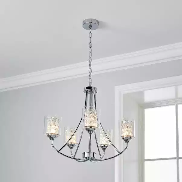 For a glamorous focal point in a room, add this beautiful Frankie Ceiling Fitting to your home. Beautifully designed with a plated chrome frame and five clear glass shades with crystals enclosed within. Complete with a height adjustable clear flex chain set, so you can choose your desired length to suit your space. This ceiling fitting has matching family items available to help coordinate your home. Dimmable compatible with suitable bulbs and light switch. A 2-year guarantee is provided with this ceiling light.