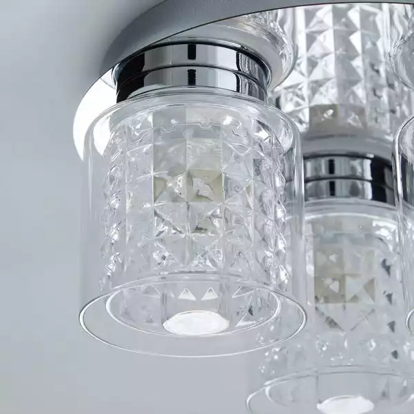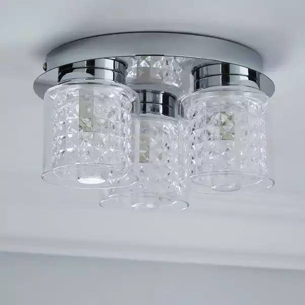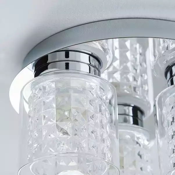 Add a touch of style to your bathroom with this chrome finished ceiling light. Made with durable materials, this flush light features three decorative glass shades and dimmable option.