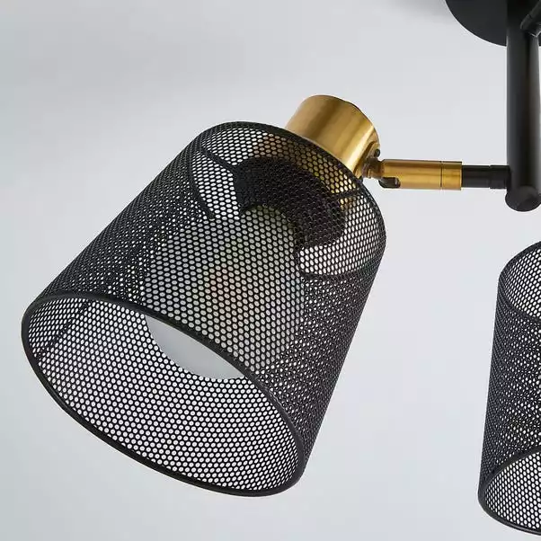 Offering a gorgeous modern style, the Idris ceiling fitting is finished in a contemporary matt black finish with contrasting antique brass features for an industrial look. This fitting features three adjustable metal mesh shades at varying heights and is compatible with dimmer switches.
