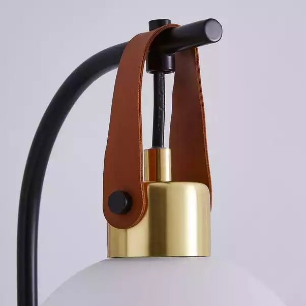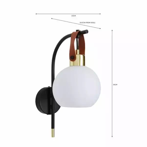 Featuring the modern Joan Wall Light, with a hanging white glass shade and finished in black metal with a Faux leather strap. With its modern colour way, this light will complement an array of home decors. Matching family items available to help coordinate your home.