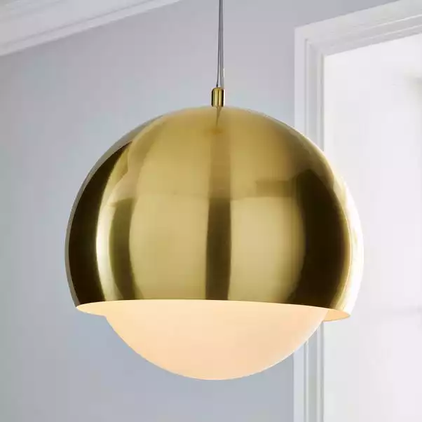 This brass ball shaped ceiling fitting has white opal glass inner and is adjustable in height. This light is also compatible with a dimmer switch and bulb.