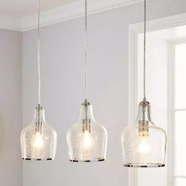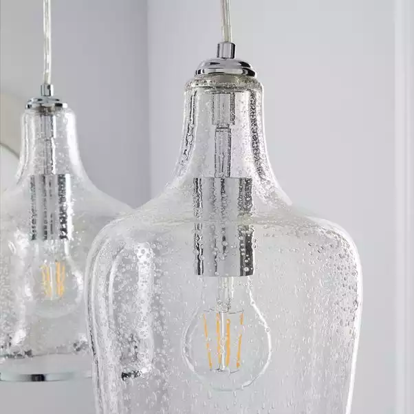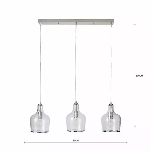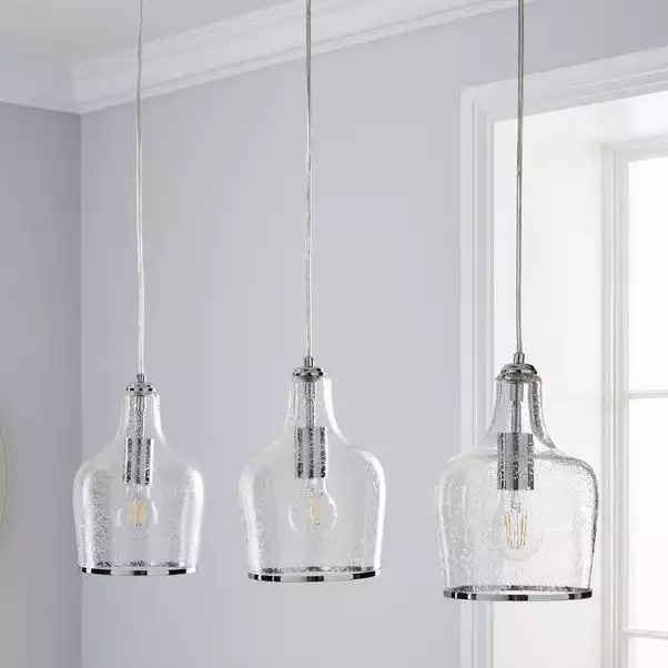 The Lenny Pendant 3 light fitting has been crafted with bubbled glass, elegant chrome trim and a matching chrome fitting for the vintage yet contemporary appearance. This light can also be adjusted at the flex. A perfect piece for adding a classic look to your home with a modern twist. This piece is dimmable compatible, making it both an attractive and practical product.