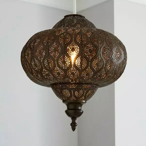 Bring a Moroccan twist to your home décor with the delicately crafted Lucena Pendant shade. This easy to fit pendant features a pressed metal design with an intricate cut out detail and comes in a warm, bronze finish.
