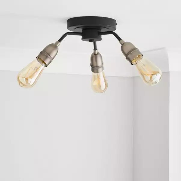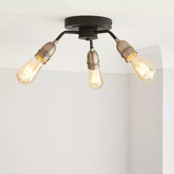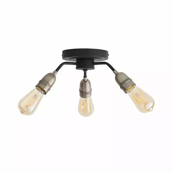 Stylishly fashioned with 3 lights, this light fitting features a sleek black finish, with antique bulb caps and amber bulbs, perfect for adding a contemporary touch to your home. The semi flush fitting makes it suitable for lower ceilings and this light comes with bulbs, and is also dimmable with a dimmer switch so you can set the perfect ambience no matter the occasion.