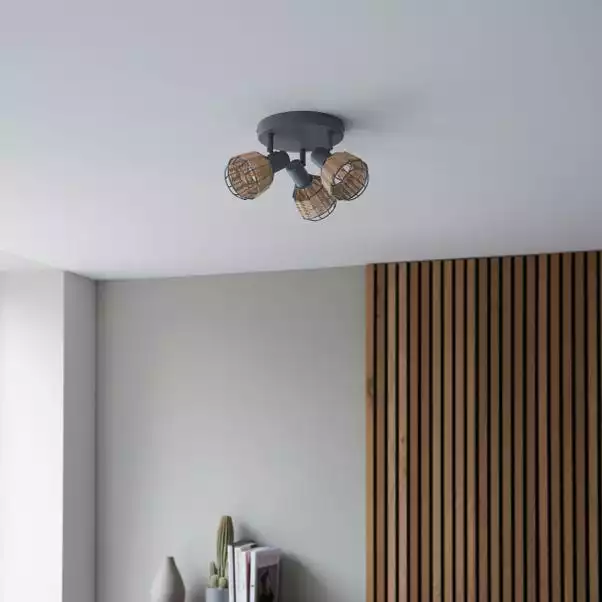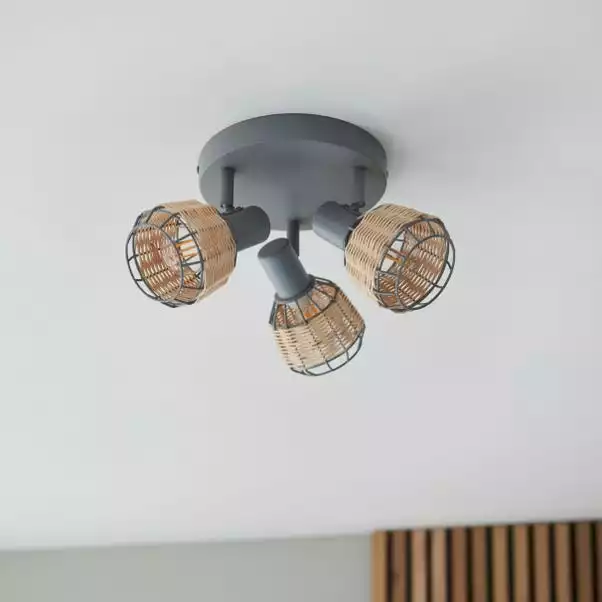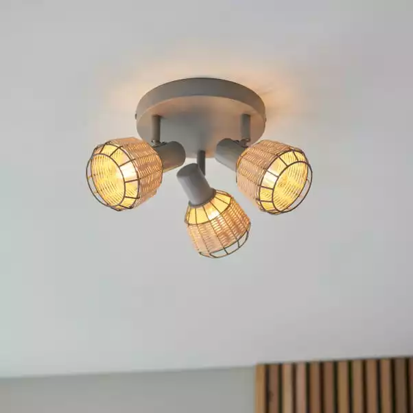 Add a natural touch to your home with this modern Ohio 3 Light Spotlight, beautifully designed with a matt light grey metal base and 3 natural wicker rattan spotlight shades, carefully woven around the grey metal wire. This adjustable spotlight will look beautiful in any room and you can even coordinate your home with matching family items. The Ohio is dimmable compatible with a suitable light switch and bulb.