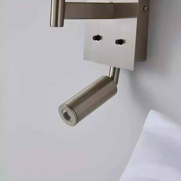 The Reader Wall Light in Ivory features a vintage shade and a stunning satin nickel finish. With a push switch included and a steel & fabric construction this is perfect for any home. The small reader light has an integrated LED with 2700 Kelvins and 160 Lumens