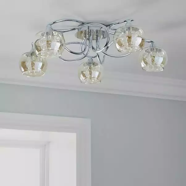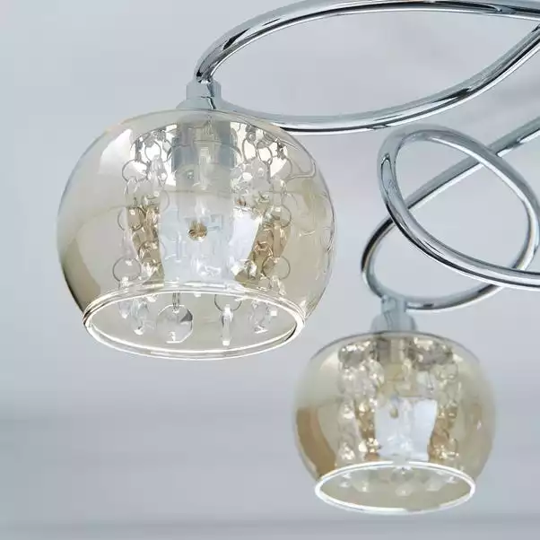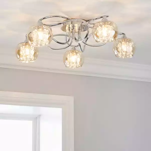 Featuring five tinted champagne bauble shades designed with delicate clear glass droplets, this ceiling fitting is made with a beautiful woven arm frame with a sleek chrome effect finish.