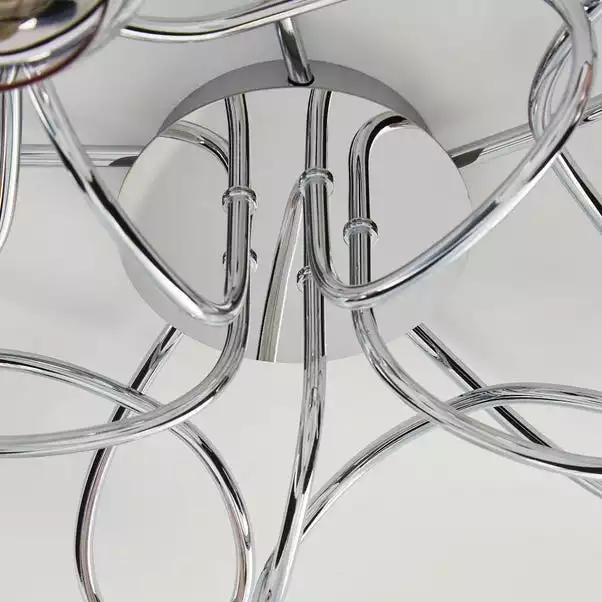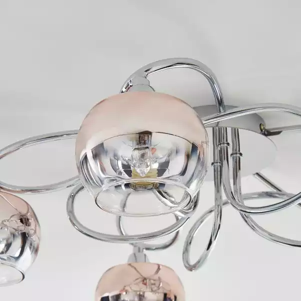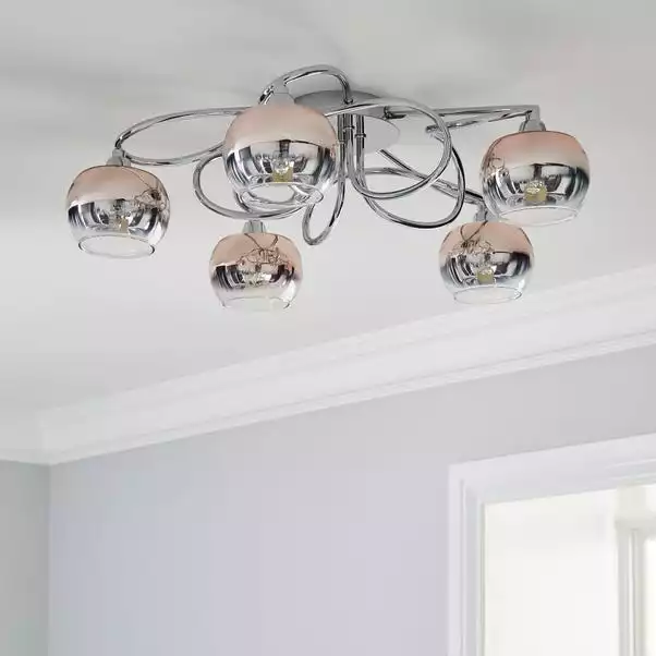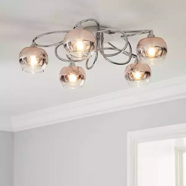 Featuring five ombre tinted blush pink glass bauble shades designed with delicate clear glass droplets, the Seychelles ceiling fitting would make a glamorous addition to any room. This beautifuly crafted fitting is made with a beautiful woven arm frame with a sleek chrome effect finish.