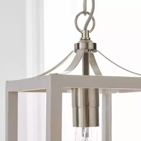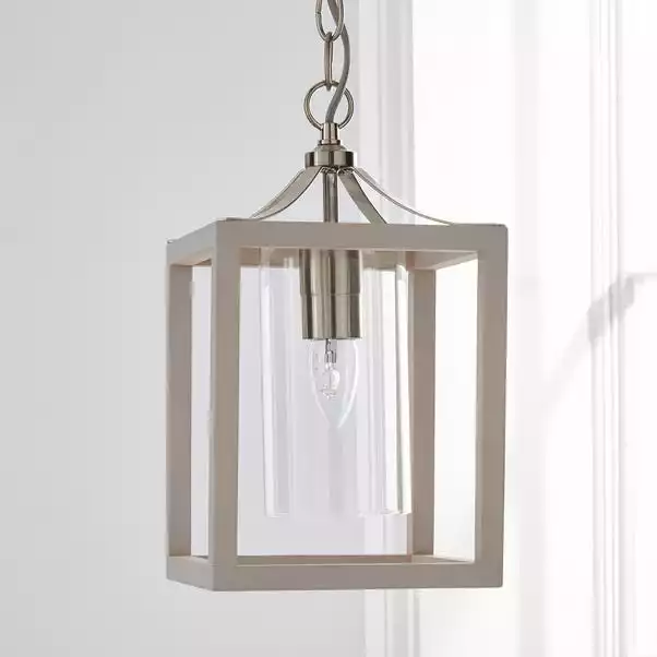 With it’s delicate light grey wooden frame and satin nickel features, the Tove Wooden 1 Light Pendant is perfect for bringing a light and elegant touch to your home décor. This stunning pendant fitting comes complete with a clear glass cylinder shade, grey fabric flex cable and adjustable chain suspension.