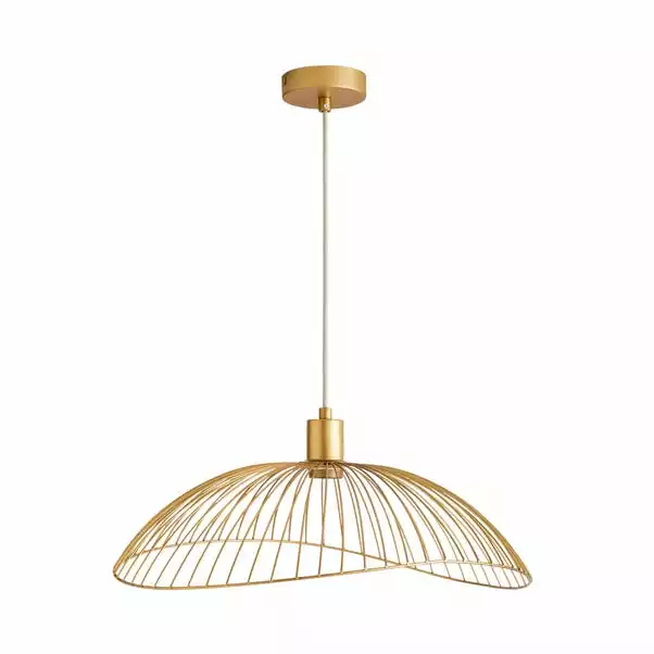 Part of the Elements trend, this beautiful Jaula 1 Light Gold Ceiling Fitting has a contemporary design that will complement an array of home decors. Featuring a satin gold effect finish base, with a height adjustable 50cm gold metal shade, perfect for adding a modern contemporary touch to any room. This piece is dimmable compatible and matching family items are available, helping to coordinate your home to create the dream look.