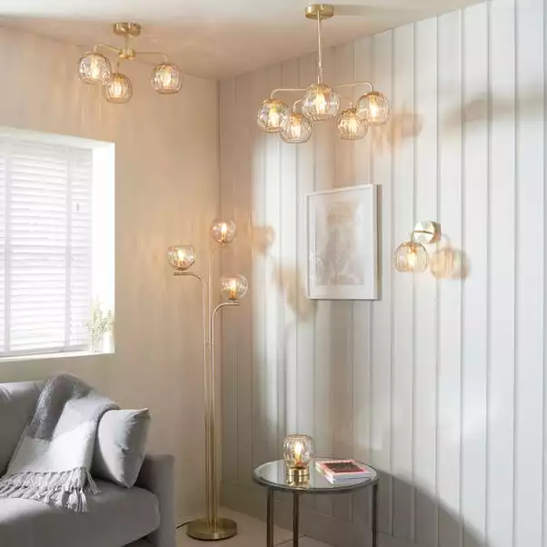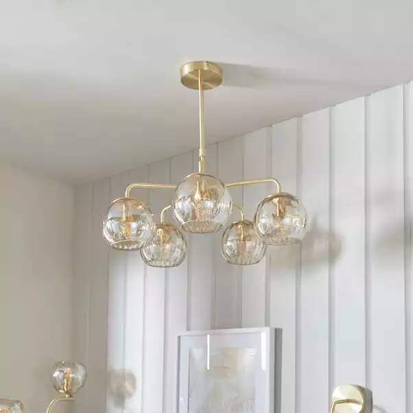 Champagne lustre glass meets modern brushed brass plating in this combination of modern and classic styling. The versatile Arkoma 5 light Chandelier is the perfect addition to any modern home, allowing you to add a glamorous finish to your interior decor, with matching items available separately to allow you to create a coordinated look. The dimpled shades are also ideal for pairing with statement filament LED bulbs for an added touch of style.