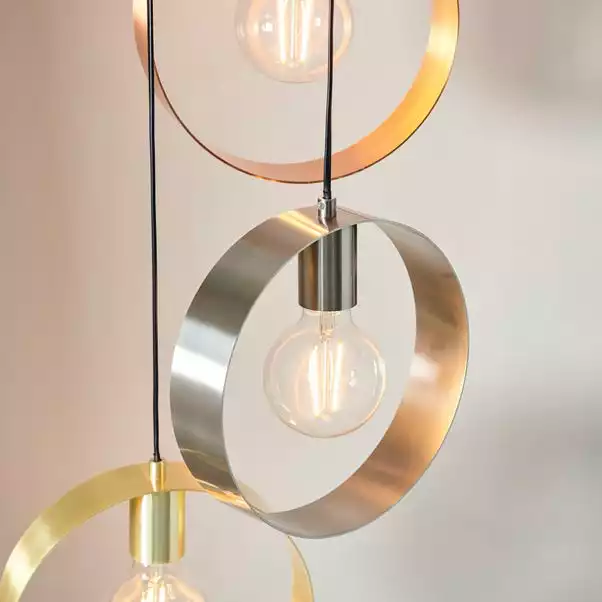 Featuring a three shade design in nickel, gold and copper colourways, the Circ 3 light mixed pendant fitting is the perfect way to add some fun, modern styling to your home. This minimalist ceiling light features fully height adjustable black flex suspension and open circular shades, making it perfect for pairing with statement LED filament bulbs to complete the modern aesthetic.