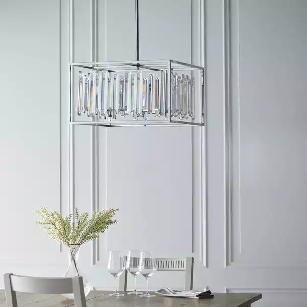 A striking mix of modern and classic styling, high quality bevelled glass crystals are effortlessly framed within the modern polished chrome metalwork of the Crystal Juneau Pendant, providing the perfect touch of grand opulent style and on-trend design. This fitting is fully height adjustable for a close to the ceiling flush look or an impressive long drop chandelier.
