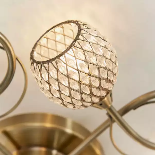 The 5 light flush Malden light fitting finished in a gorgeous antique brass will add style to any room. This low-profile light fitting features stylish swirled arms, capped by mesh shades encrusted with clear glass beads. Suitable for use with LED G9 lamps.