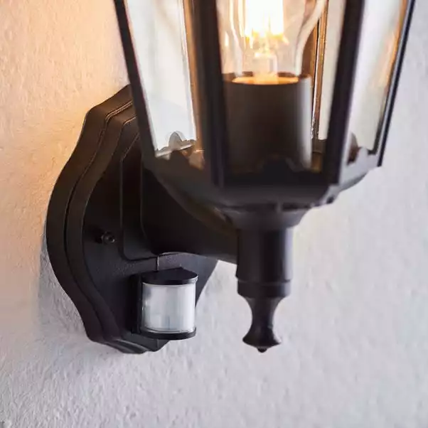 Add a traditional and timeless coach lantern style wall light to your garden with Trenton Outdoor Light range. Safe for outdoor use with a IP44 rating the Trenton Outdoor PIR Wall Light comes complete with built in Photocell & PIR sensors for excellent accessibility and can also be operated with mains function. Made from die cast aluminium alloy, this piece of lighting is robust and brings a classy appearance with a clear glass shade, matt black finish and can be combined with other items from the Trenton Outdoor light range for a synchronised and coordinated look